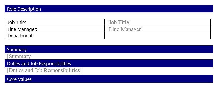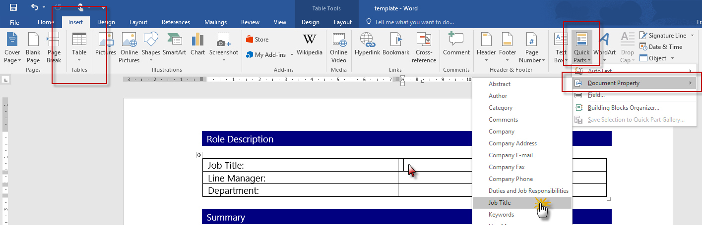 The template will now open in Word, modify this to be your new Job Description Template (you can copy and paste an existing one into the new Word document). Go to the areas that will be linked to the columns you created in SharePoint. Click on the Insert Tab, Quick Parts > Document Properties. You will now see your SharePoint columns in the dropdown. Add these fields where the normal text used to be on the document.