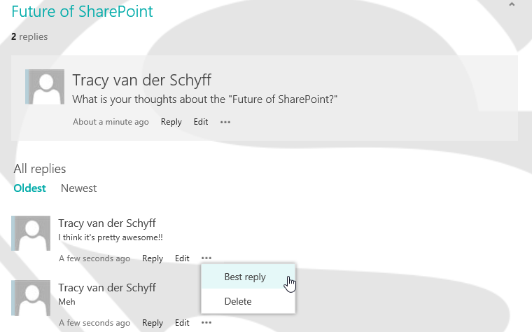When the discussion is added, you’ll see it on the page, keep in mind you might have many discussions going on at the same time. You have to click on the Discussion to open it and reply to it. You can reply to the Discussion or even to one of the existing replies. Notice the ability to mark a reply as best, and delete replies: