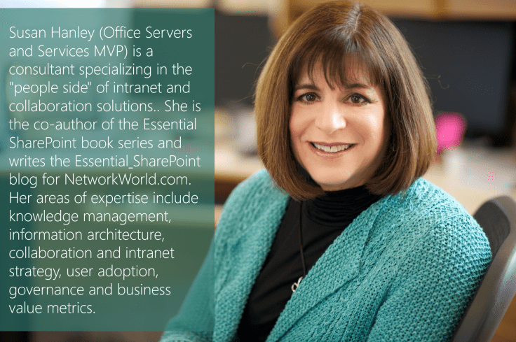 Now, as part of my blog challenge I would like to feature someone every week. Whether it be advice, tips & tricks or a code snippet they’d like to share. This week’s Babel Fish is brought to you by Susan Hanley. I’ve known Sue for a couple of years and consider her a friend and mentor as well as someone I look up to. See more on Essential SharePoint Blog – Twitter – Website – LinkedIn