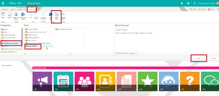 - Insert Tab > Web Part > Media and Content > Script Editor > Add