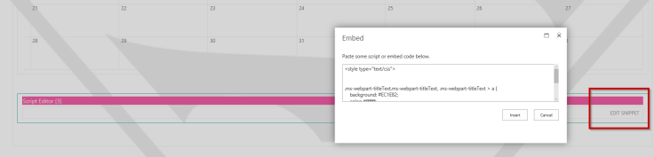 Once the web part is added, edit the web part to add the code. In the top right corner of the web part is a dropdown – select “Edit Web Part”. Then click on Edit Snippet (read here for more on Script Editors). Add the below code in the ‘text box’ and click on Insert to finalize. Remember to change the Hex codes to the colours you would like to use.