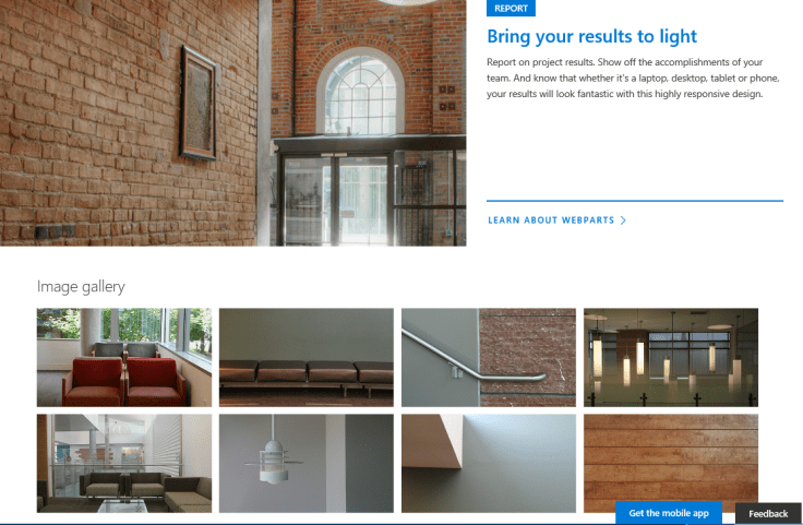 This is the landing page you get on the Showcase template. Scroll down for a look at the web parts included by default:
