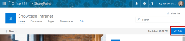 To edit the page simply click on the Edit button to the right of your page. Now when you hover over web parts, you will see the option to edit:
