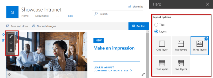 When editing the Hero web part, you’ll have the option to change the layouts. For Showcase designs, the layout is set to Layers. Change these based on how much information you would like to “Showcase”. I had some trouble changing the layout to show more, and then actually add more content. Hopefully this will be solved soon.