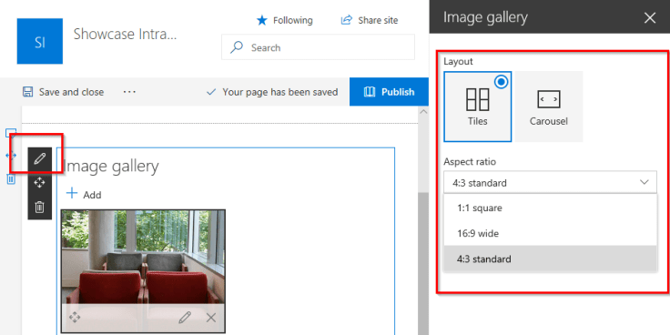 The page needs to be in edit mode. First we’ll take a look at editing the main web part. Here you have the option to choose Tiles / Carousel layout. The aspect ratio of images can also be set: