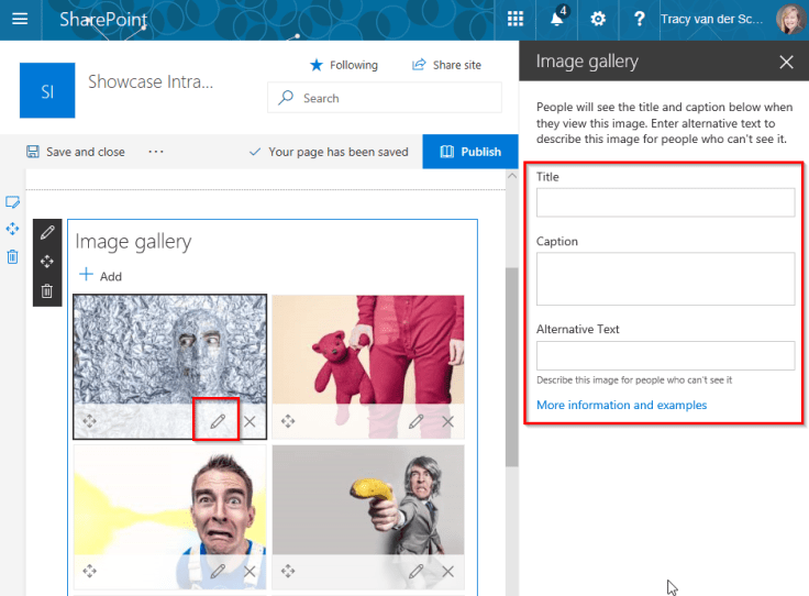 Next up, each image can be modified. The easiest for me was to just drag images onto the web part – then go to each of them to modify the Title, Caption and Alternative Text: