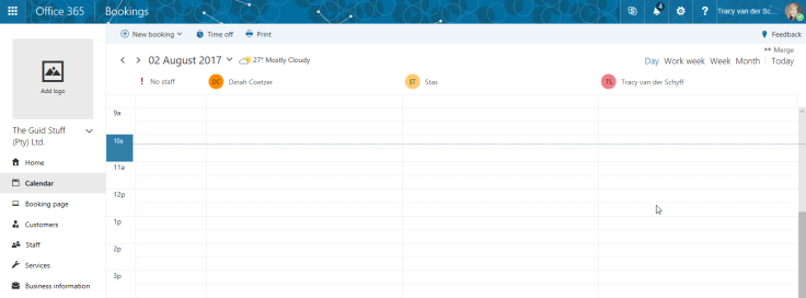 This is your Bookings calendar and if calendars are added for sync (under Staff), you will see availability here. You can make bookings here as well and add Time Off for staff.
