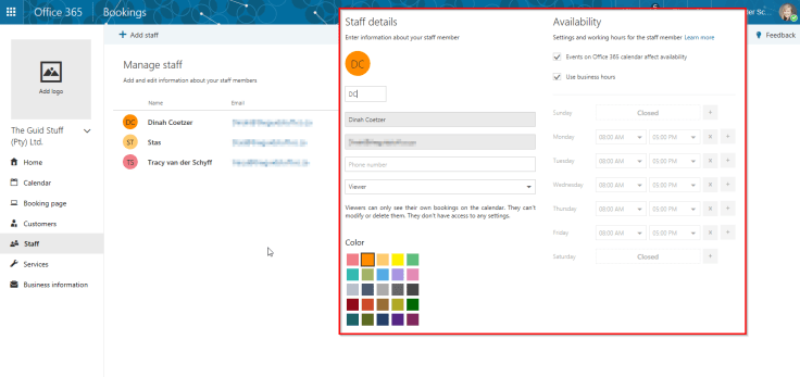 Edit the staff member to add their availability to the Bookings Calendar as well as specify Business Hours, permissions and colour to use.