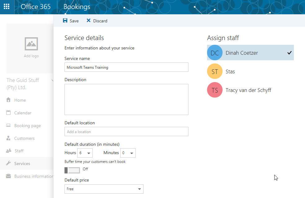 Create services to pick from on the Bookings calendar and assign staff to specific services: