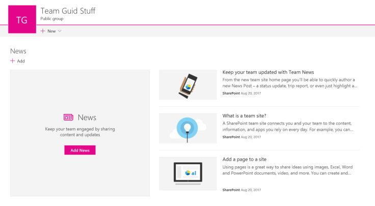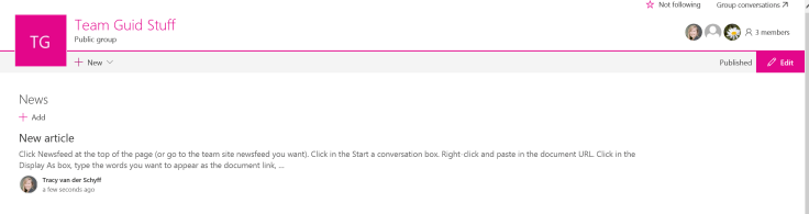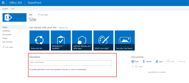The SharePoint Newsfeed web part appears on the landing page of the ‘not so modern’ Team Site templates. The purpose of these would be to have conversations and stay current with other posts etc. Think micro-blogging. In all honesty – I have never used the Newsfeed and always remove it when a site is created as I prefer Discussion Boards. I have seen clients use this to post a message to a team / department when a new site is created. Below you’ll see the web part on my team site landing page.