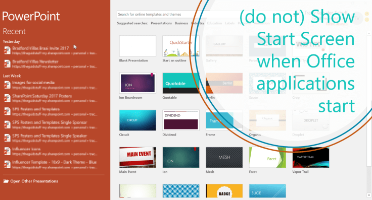When opening Word, Excel etc., this is normally the screen you are greeted with. It’s quite cool as it exposes people to the various templates available, but if you are familiar with these, and you just click on blank document – then it wastes time.