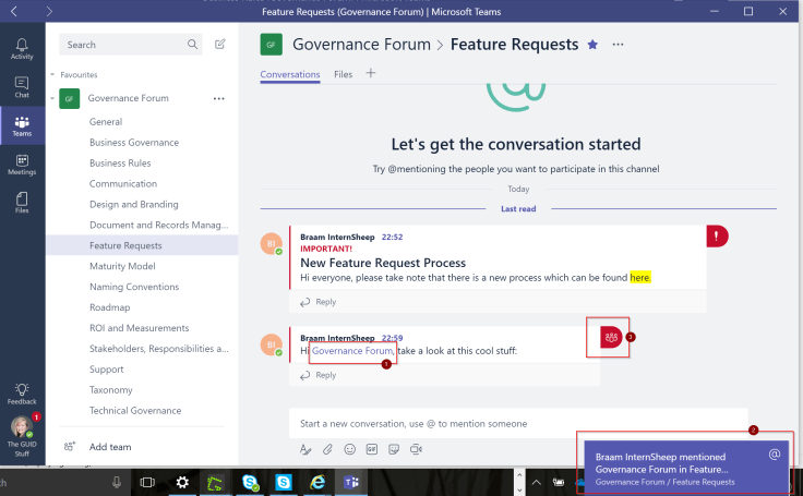 The @mentions can work in two ways. You can either @mention the whole team by typing the Team name (remember this is an Office 365 Group). This will pop up at the bottom of your task bar and get your attention.