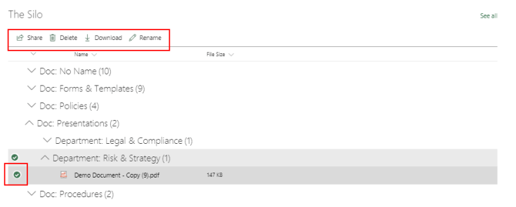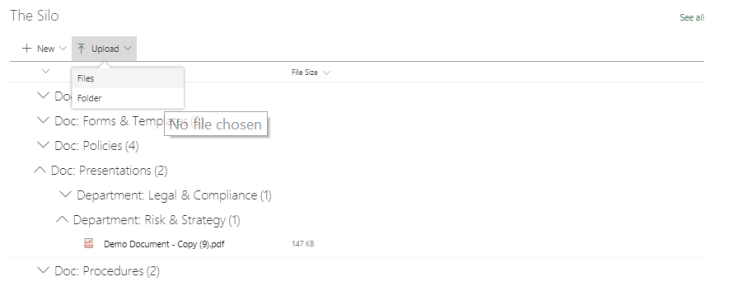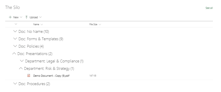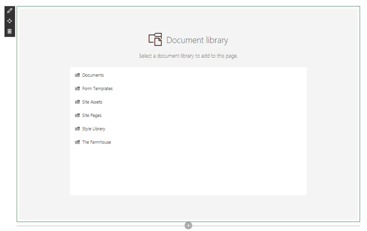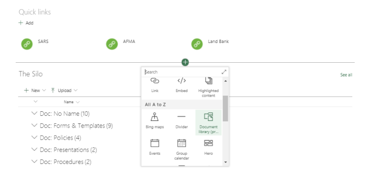 The Document Library web part allows you to display a document library and customize it with your own title, view, and even size. Users with appropriate permissions can view or edit files directly from the web part, or can go the full document library by clicking See all. Use the Document Library web part on a page.