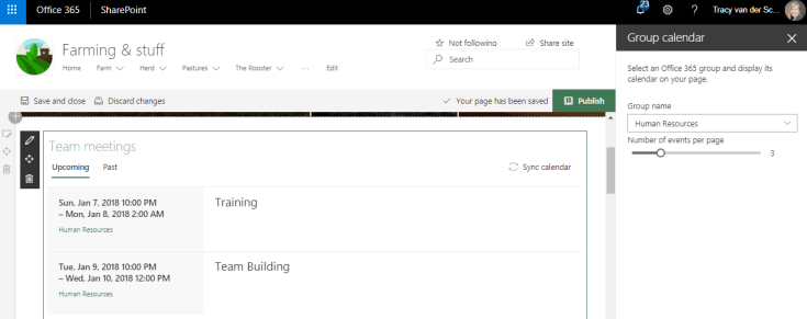 The Group calendar web part allows you to put an Office 365 group calendar right on your page so that it is easily visible to your readers. Use the Group calendar web part.