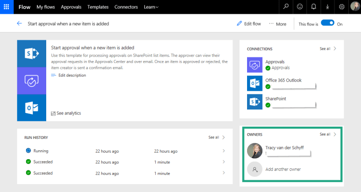 Here you’ll see the Connections as well as the owners of the Flow (the person who created it will appear here). Click on Add another owner. This will allow for you to add a team of people responsible for supporting or updating the Flows: