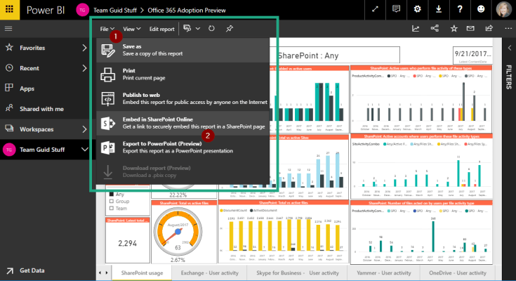 To get the link to the report, open the report in Power BI, click on File (1) then on Embed in SharePoint Online (2):