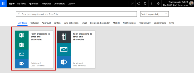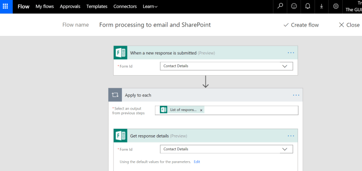 In Flow there is a template I can use to gather results from Forms and publish it to a SharePoint list: “Form processing to email and SharePoint”