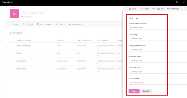 First up I created a custom list in SharePoint. I renamed the Title to Name and Surname, then added Email address, telephone, company and twitter handle.