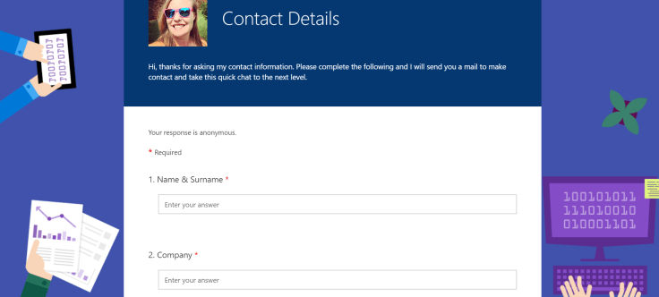 #Microsoft365 #Office365 #MSTechSummit #MSForms #MSFlow #SharePoint I was fortunate to present at and attend the Microsoft Tech Summit in Cape Town this week. Typical to my nature, business cards and ‘talking shop’ was the last thing on my mind during the conference as I am so community focused. That did not stop a LOT of people asking me for business cards. I so dislike the idea of business cards that I came up with a creative way to solve the exchange of contact details.