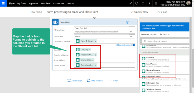 Now you’ll configure the “Create Item” part where it writes back the Form data to the SharePoint List. This is why it’s important that your columns are the same as it’s easier to pick: