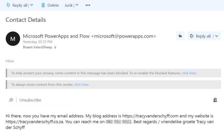 Here’s an example of the email the new contact will receive. Sure this can be ‘prettyfied’ a bit. As it sends it from PowerApps and Flow – I’d like to investigate how to change the senders address so that it would be mine. Or I’ll have to add my email address to the body of the mail.