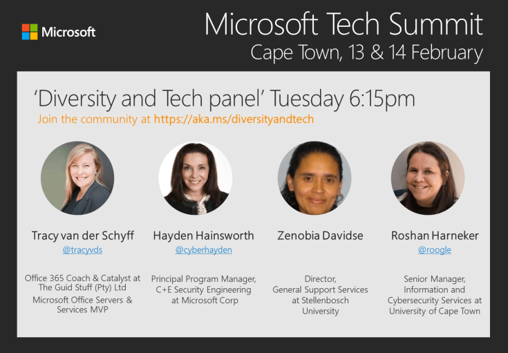 #Microsoft365 #Office365 #Diversity This week I celebrated my 43rd birthday, and no, I’m not fishing for congratulatory well-wishes. I do however have a message I would like to share with you. One about Diversity in Tech AND the different roles and responsibilities. With age comes (a bit of) wisdom and reflection I suppose. At the recent #MSTechSummit in Cape Town I had the privilege of moderating the Diversity in Tech Panel Discussion. Difficult to say the least, as I’m normally quite opinionated and loud, and now I had to ask the questions and moderate the discussions. I did however share two ‘thoughts’ which I’ll expand on. This is NOT a 5 minute read.