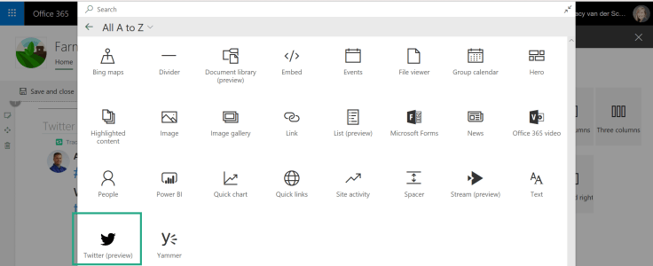 Edit your page and click on the “+” sign to add a web part. Here you’ll see Twitter (still in preview). Select the web part: