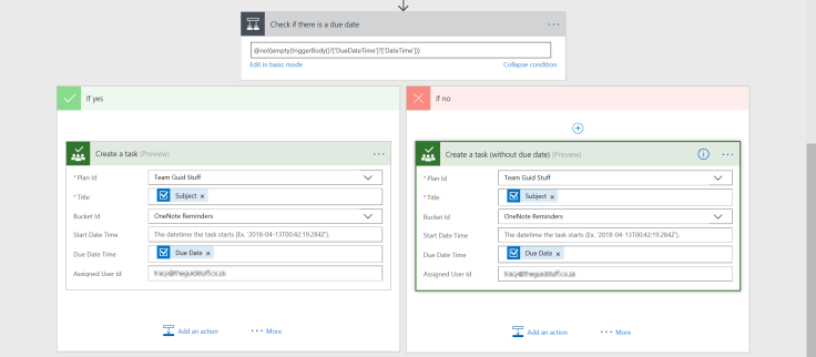I created a bucket in my planner for my Microsoft Team called “OneNote Reminders” and added an action to create a task here with the Outlook task as a trigger: