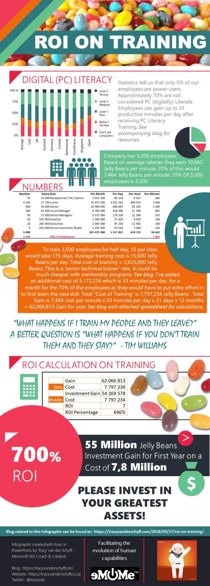 Approximately 70% of your users do not have an acceptable PC Literacy Levels. Users can gain up to 33 minutes of productivity time per day after receiving basic PC Literacy training. Based on this, I’ve created an infographic to share the ROI on Training. Here is the spreadsheet I’ve used for my calculations. Feel free to use this to calculate the ROI on Training in your company. I’m only human, if I’ve made a mistake anywhere, please let me know and I’ll correct it. If you have any tips that you think are valuable and you would like me to add them to the list, let me know.
