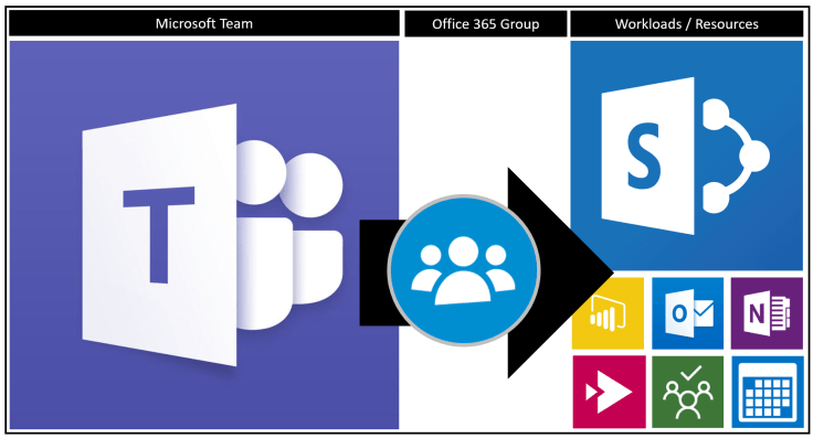 Office 365 Groups is the cross-application membership service in Office 365. At the basic level, an Office 365 Group is an object in Azure Active Directory with a list of members and a loose coupling to related workloads including a SharePoint team site, Yammer Group, shared Exchange mailbox resources, Planner, PowerBI workload and OneNote. You can add or remove people to the Group just as you would any other group-based security object in Active Directory.