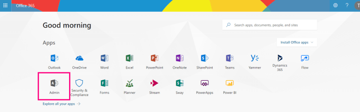 Depending on your access, you’ll see the Admin Center between your other Apps when going to https://office.com. You might have to click on “Explore all your apps” if it’s the first time you’ll use it:
