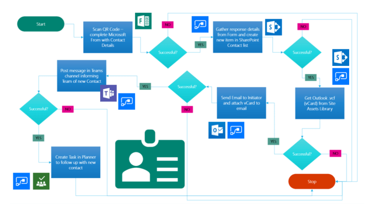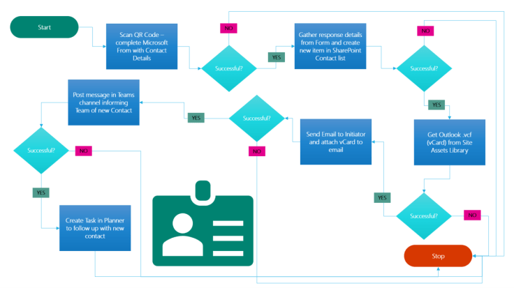 Now that you have so many resources to help you, I want to say: “Take it easy, start simple.” You don’t have to create fancy flowcharts from day one, use shapes to describe what needs to be done – this really helps to spot steps you might have missed in your notes. Below you’ll see a PowerPoint “flowchart” I did for my Contacts Process I wrote with Forms, Flow, SharePoint, Outlook Teams & Planner. You’ll see I didn’t really follow the “fancy pants” methodologies – but at least I documented it, which is a good start. Be better than me and try to already use the identifiable shapes which will be recognized for what they are. That’s just a good habit to start working on from day one.