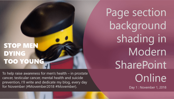 It’s time to catch-up with all the announcements at #MSIgnite. And the only way I learn, is by researching, trying and sharing. So let’s go! Today’s blog will cover the “Page section background shading” available on Modern #SharePoint Online sites soon. Inspired to a new “1 Blog A Day for a Month Challenge” by Ali Spittel (@ASpittel), thanks Ali! Seeing as it’s November, I’ve also decided to dedicate the blogs to a noble cause: The Movember Foundation. #Movember2018 #Movember
