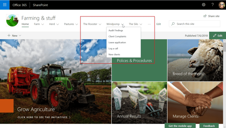 Typically the global (top) navigation in SharePoint only allowed for a single dropdown and no groupings / headings. This announcement makes a lot of sense and solves a lot of problems as companies has been customizing SharePoint to achieve this. Below you’ll see a screenshot of the current OTB navigation: