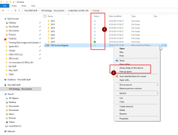 Next to the name you’ll see the status column (1) which indicates whether it’s available offline and if I right-click on a folder / document I can download it (Always keep on this device) or decide to Free up space (if I don’t need it offline anymore).