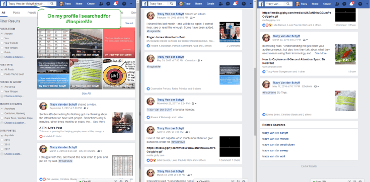 Did you know that hashtags used in social media posts not only means other people can find your stuff, but also that you can find it faster. For example, I post a lot of cool articles about self-development and improvement. But believe me, it’s near impossible to find it again when I cannot remember the author or title. So when I post something, I use the hashtag #InspireMe in the post. This means at any time I can go to my profile and search for #InspireMe and I’ll find all my related posts again. You can even filter on the left to further refine your results. See below to illustrate: