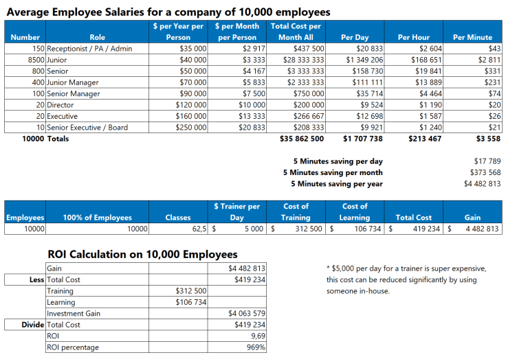 In a company of 10,000 users it will take about 62.5 days to train them to use OneDrive (30 min each, 20 in a class, 8 sessions per day), at a cost of $5,000 per day for the trainer as well as the ‘cost’ of the users for 30 minutes to attend the training, then you’ll have a productivity gain of $4,500,000 and investment gain of $4,000.000 for the year. HOW IS THAT NOT WORTH THE TROUBLE?