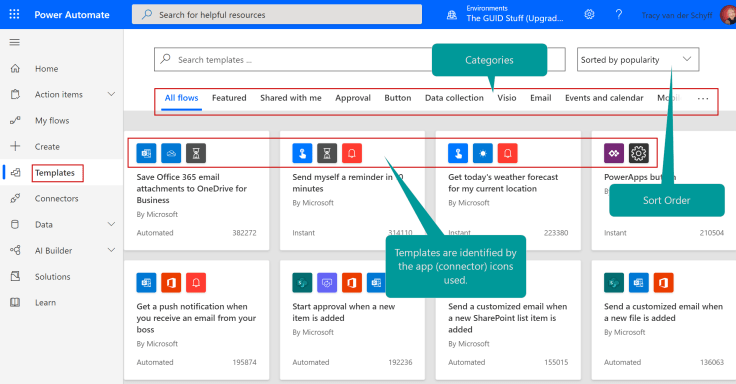 At the top you’ll see the categories you can filter by and the sort order. It’s also easy to identify the template by the icons used for the apps (connectors):