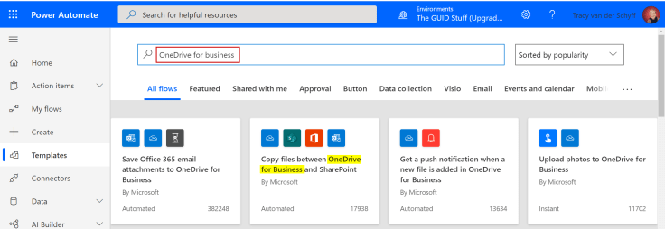 The search option is easiest for me. Below you’ll see I searched for “OneDrive for Business”. This will return results on all templates that includes OneDrive for Business. Be careful when just searching OneDrive – as it might return templates for OneDrive Personal (Consumer). If you want to automate tasks related to your OneDrive in your Office 365 account – that’s OneDrive for Business: