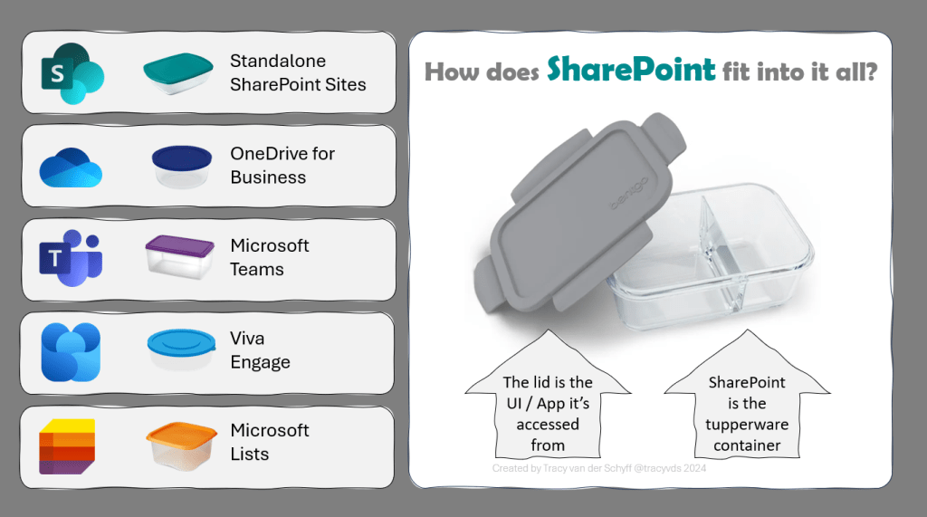 It’s actually like Tupperware. #SharePoint is the container, the lid is the Application UI. Dumbfoundingly simple, but true. This is also why many of the features in apps like OneDrive, Teams, Viva Engage and Lists are actually SharePoint features. So apart from Standalone SharePoint Sites and SharePoint sites connected to your Microsoft Teams – when someone new starts in the company a “personal SharePoint site collection” is created for that person to use as their own OneDrive (for Business), Depending on where you build Microsoft Lists, they’re either stored in your OneDrive or a shared SharePoint site. And of course Engage (Yammer) also stores its content in SharePoint.