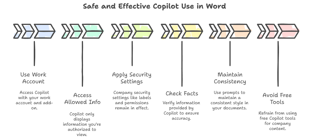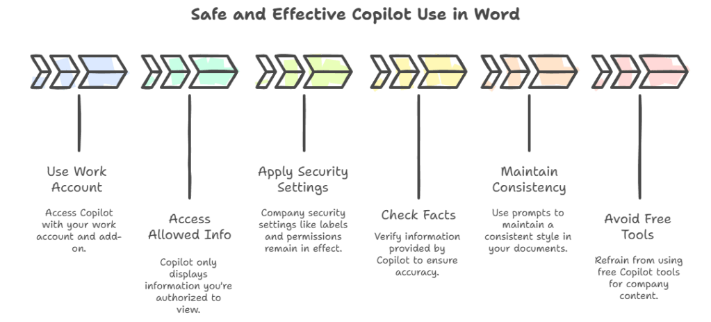 Important Tip: Always use Copilot in Word with your work account. Don’t paste company info into free or consumer Copilot or any other AI tools.