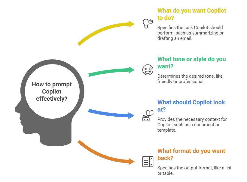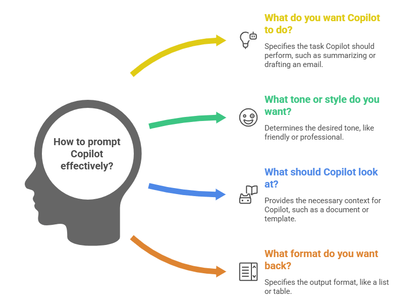 Instead of memorizing prompts, think of Copilot like someone helping you get things done. And to give good help, it needs clear instructions. A simple decision tree (a “choose‑your‑own‑path” guide) does exactly that.