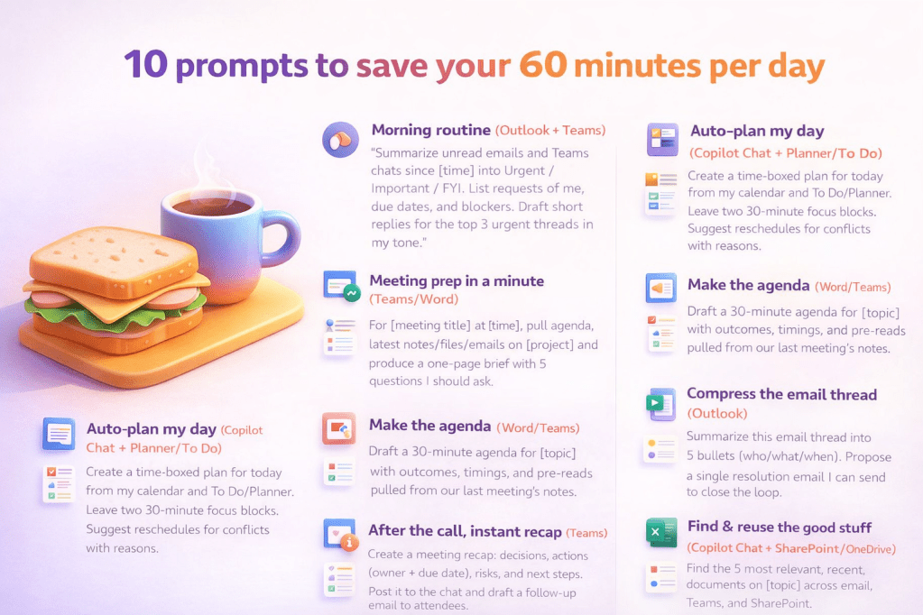 “Summarize my unread emails and Teams chats since [time] into Urgent / Important / FYI. List requests of me, due dates, and blockers. Draft short replies for the top 3 urgent threads in my tone.”