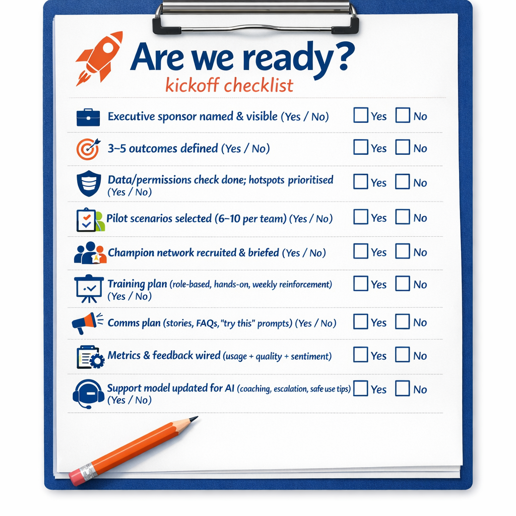 Copilot adoption works when you treat it as behaviour change, not a software launch. Run leadership, technical readiness, and human change in parallel; start with a small pilot, scenario‑based training, and champions; measure quality as well as usage; and modernise support to coach safe, confident use.